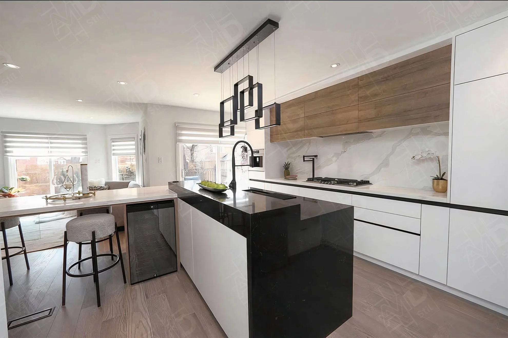 A white marble backsplash added brightness, while the black island countertop created bold contrast. AMD STIL handled the precise installation, ensuring a clean finish that brought the design to life.