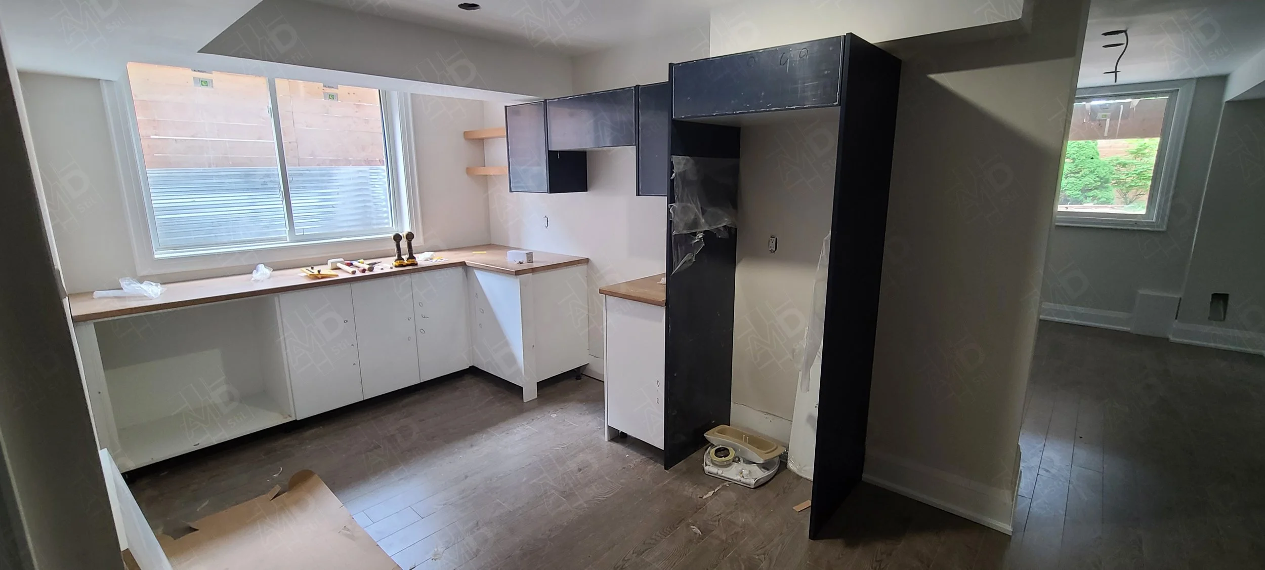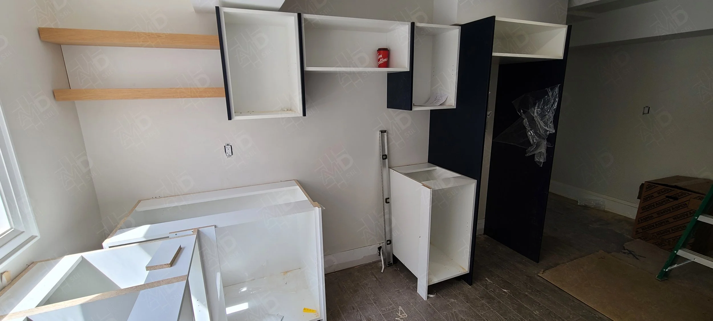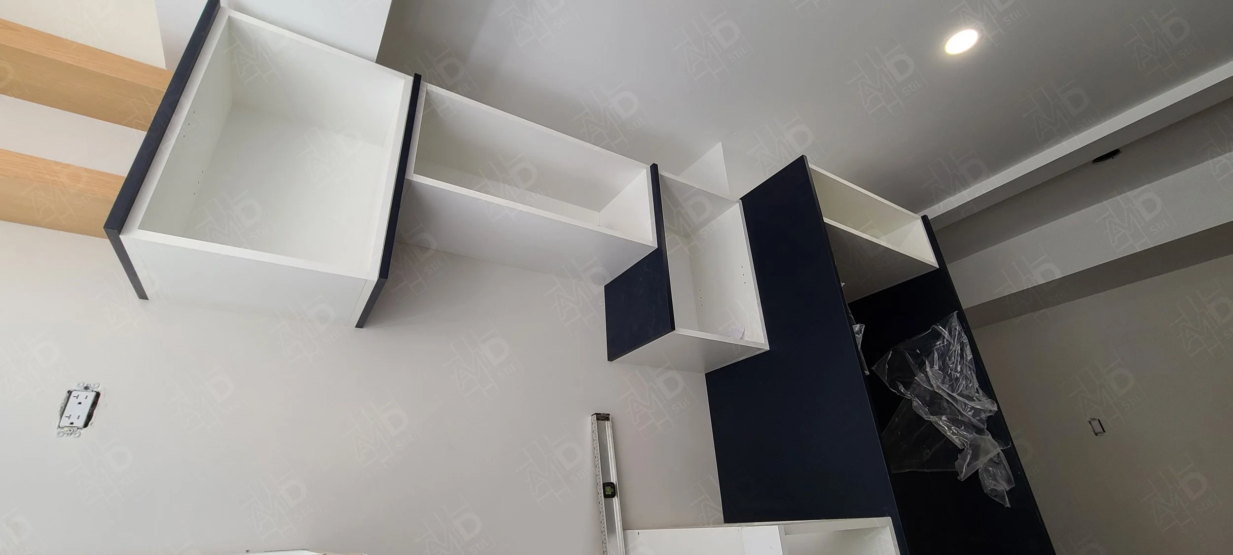 AMD STIL installed a compact yet elegant custom cabinet in Scarborough. The design combined matte white and matte navy finishes on AGT panels, paired with maple shelves and a matching countertop for a warm natural contrast.